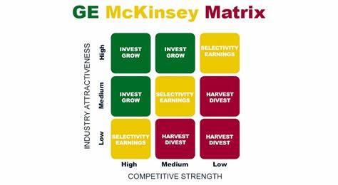 麦肯锡矩阵分为一个3x3网格,每个单元格代表市场吸引力和竞争力的特定组合: